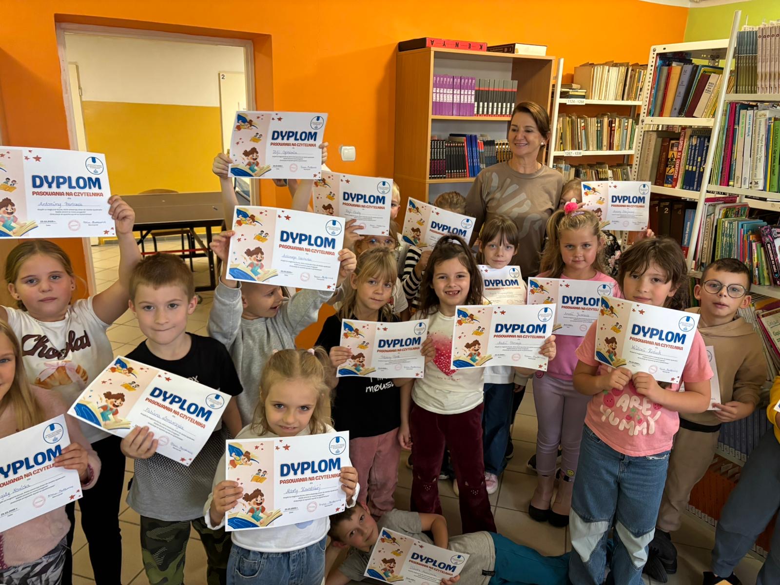 Podczas uroczystości dzieci poznały regulamin biblioteki, odpowiadały na pytania, wykonywały różne zadania, a na koniec otrzymały pamiątkowe dyplomy. 🏅📖
